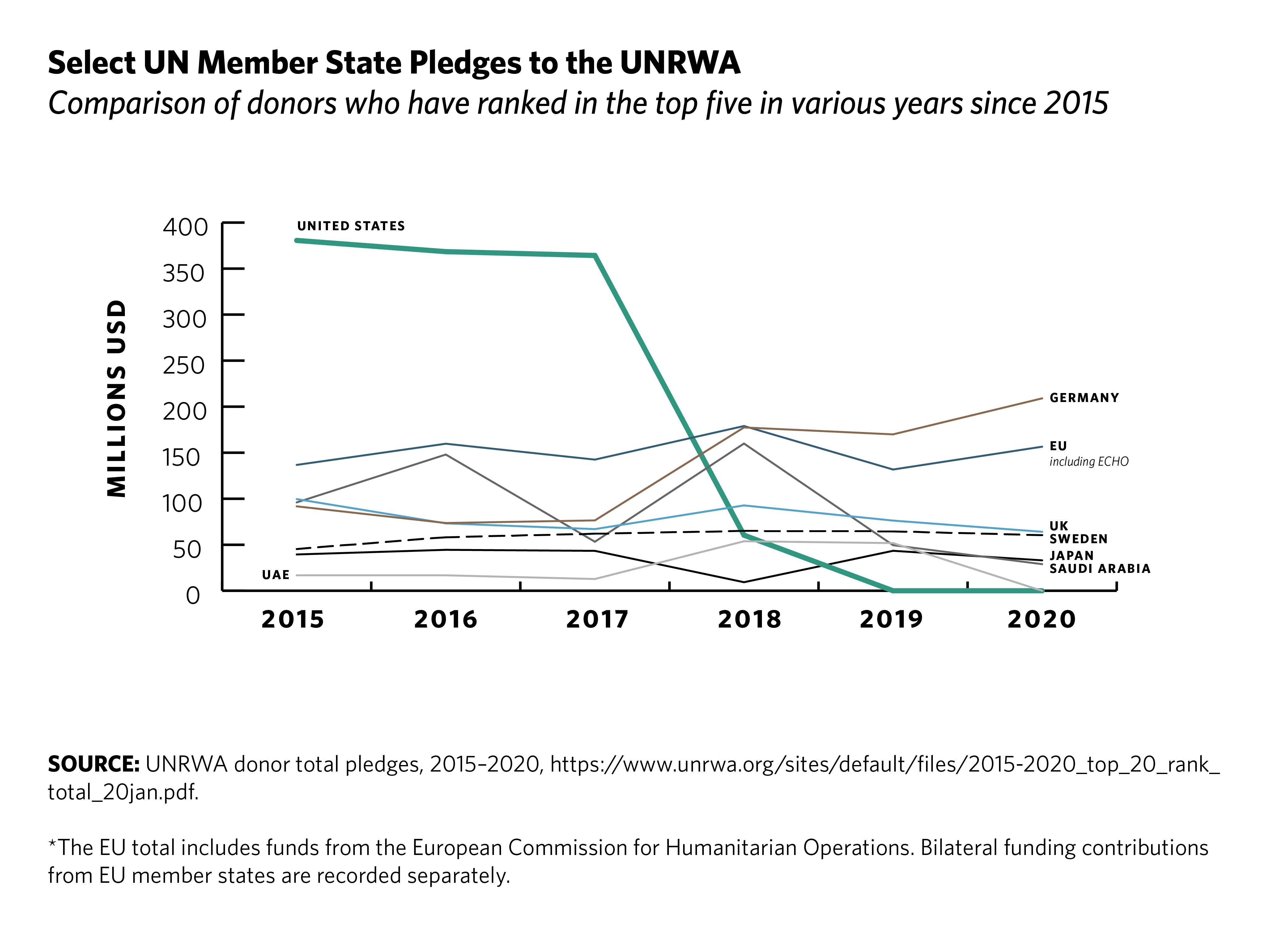 The Trump administration stopped U.S. funding to the UNRWA (which previously represented one-third of the agency’s budget) and sought to redefine who qualifies as a Palestinian refugee (see box 1). The agency was already struggling to provide essential primary healthcare, education, and microlending and employment opportunities to the more than 5 million refugees in the occupied Palestinian territories and in Jordan, Lebanon, and Syria.6